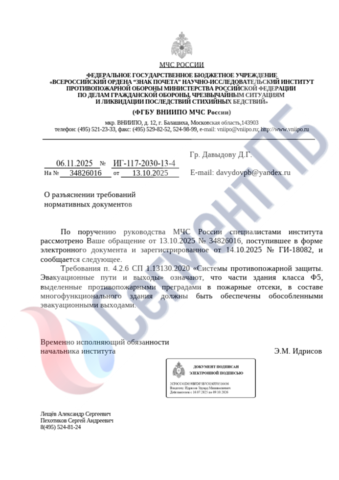 Текст ответа: По поручению руководства МЧС России специалистами института рассмотрено Ваше обращение от 13.10.2025 № 34826016, поступившее в форме электронного документа и зарегистрированное от 14.10.2025 № ГИ-18082, и сообщается следующее. Требования п. 4.2.6 СП 1.13130.2020 «Системы противопожарной защиты. Эвакуационные пути и выходы» означают, что части здания класса Ф5, выделенные противопожарными преградами в пожарные отсеки, в составе многофункционального здания должны быть обеспечены обособленными эвакуационными выходами.
