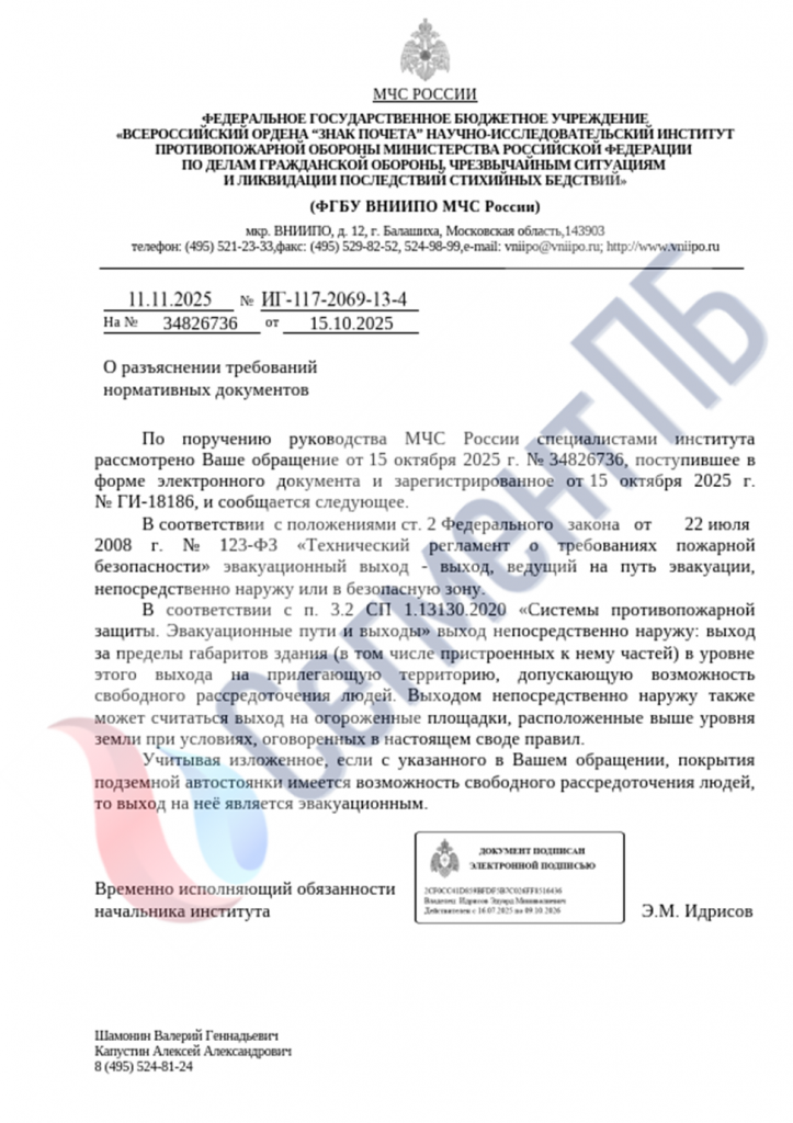 Ответ ВНИИПО по вопросу устройству эвакуационных выходов на стилобат (№ИГ-117-2069-13-4 от 15.10.2025)