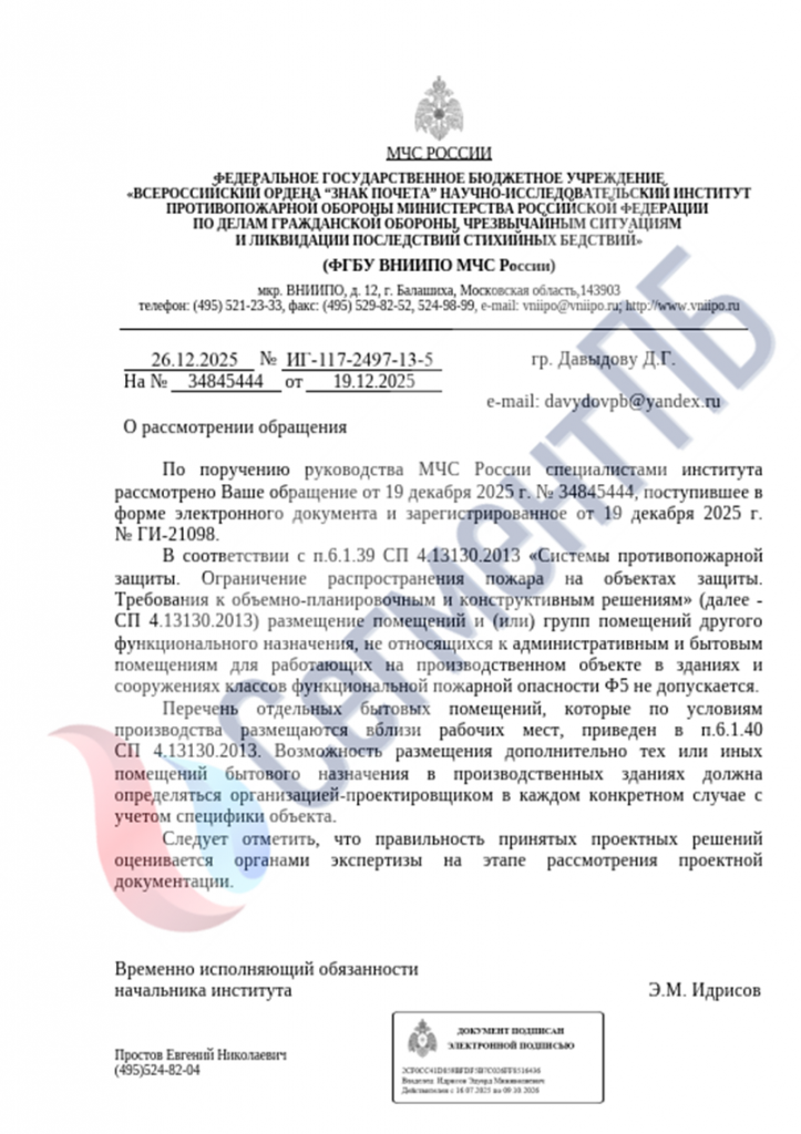 Текст ответа: В соответствии с п.6.1.39 СП 4.13130.2013 «Системы противопожарной защиты. Ограничение распространения пожара на объектах защиты. Требования к объемно-планировочным и конструктивным решениям» (далее -СП 4.13130.2013) размещение помещений и (или) групп помещений другого функционального назначения, не относящихся к административным и бытовым помещениям для работающих на производственном объекте в зданиях и сооружениях классов функциональной пожарной опасности Ф5 не допускается.