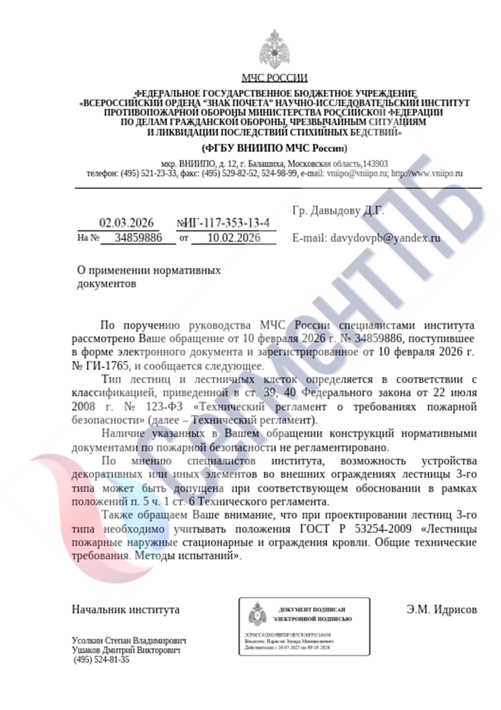 По мнению специалистов института, возможность устройства декоративных или иных элементов во внешних ограждениях лестницы 3-го типа может быть допущена при соответствующем обосновании в рамках положений п. 5 ч. 1 ст. 6 Технического регламента.