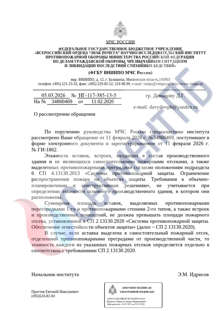 Текст ответа: Этажность вставок, встроек, входящих в состав производственного здания и не являющихся самостоятельными пожарными отсеками, а также выделенных противопожарными преградами согласно положениям подраздела 6 СП 4.13130.2013 «Системы противопожарной защиты. Ограничение распространения пожара на объектах защиты. Требования к объемно-планировочным и конструктивным решениям», не учитывается при определении этажности основного производственного здания, в котором они расположены.