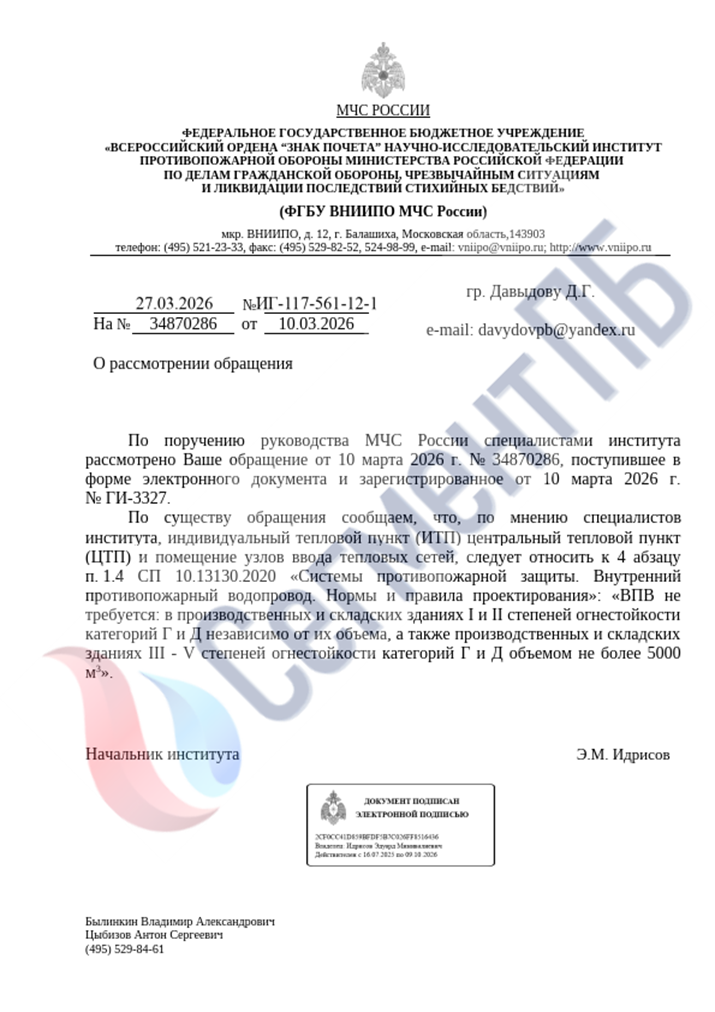Текст ответа: по существу обращения сообщаем, что, по мнению специалистов института, индивидуальный тепловой пункт (ИТП) центральный тепловой пункт (ЦТП) и помещение узлов ввода тепловых сетей, следует относить к 4 абзацу п. 1.4 СП 10.13130.2020 «Системы противопожарной защиты. Внутренний противопожарный водопровод. Нормы и правила проектирования»: «ВПВ не требуется: в производственных и складских зданиях I и II степеней огнестойкости категорий Г и Д независимо от их объема, а также производственных и складских зданиях III — V степеней огнестойкости категорий Г и Д объемом не более 5000 м3».